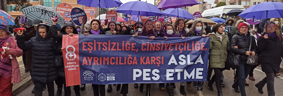 8 Mart Dünya Kadınlar Günü`nde `Asla Pes Etme` diyerek yine alanlardaydık. Nilüfer Kent Konseyi önünden başlayan coşkulu yürüyüş, İhsaniye Kapalı Pazar Alanı`nda sonlandı. Barış Kadın Bandosu`nun keyifli performansıyla devam eden etkinlikte Kadın Meclisi Başkanı Serpil Altun ve Nilüfer Belediyesi Başkan Yardımcısı Dr. Sibel Özer basın açıklaması yaptı.