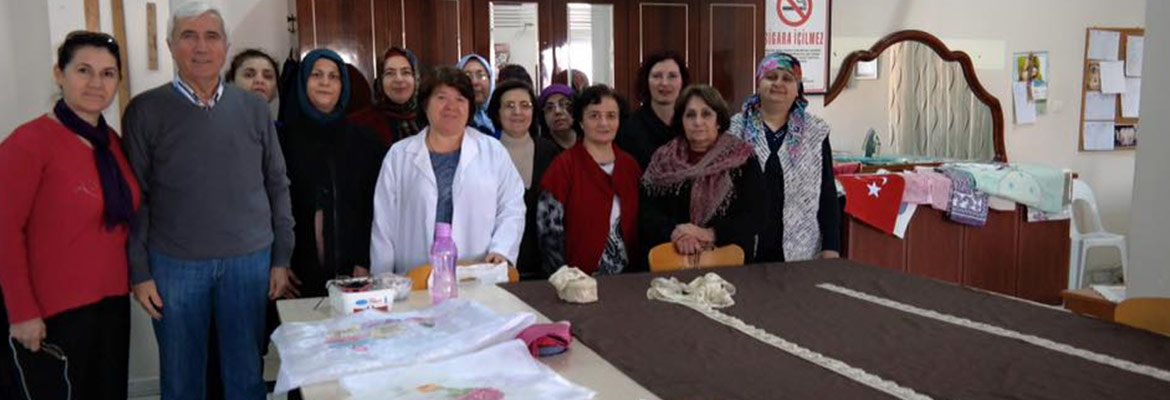 Nilüfer Kent Konseyi Başkanı Şazi Çavuşoğlu ve Kadın Meclisi Kolaylaştırıcısı Elif Yuvayapan Soner'in ziyaret ettiği atölyede el emeği göz nuru işlemeler yapılıyor.