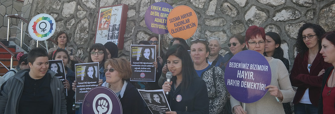 Bugün, yaşanan tecavüz olayına sessiz kalınarak, yine katilin değil, maktülün yerden yere vurulması sonucu ölüme sürüklenen Cansel için buradayız. 2015 yılında 303 kadın öldürüldü, bunların % 25’i 25 yaş altında..