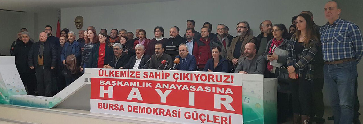 Bursa Demokrasi Güçleri olarak bizler, halkımızın genel çıkarları, toplumsal vicdanımız ve çocuklarımızın aydınlık geleceği adına, söz konusu anayasa değişikliğine “HAYIR” diyoruz.