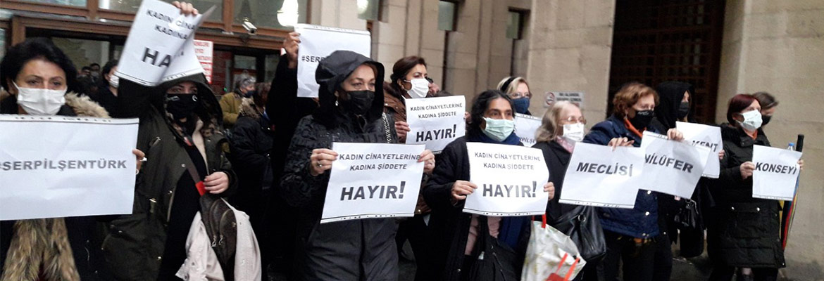 Nilüfer Kent Konseyi Kadın Meclisi gönüllülerimiz, 20 Ağustos 2020`de boşanmak istediği eşi tarafından öldürülen Serpil Şentürk`ün duruşması için Bursa Adliyesi önündeydi. Sanık Cenk Karataş`ın ağırlaştırılmış müebbet hapis cezası almasının ardından Kadın Meclisi Başkanımız Serpil Altun, basın açıklaması yaptı.