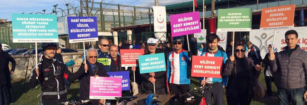 Bin metre bisiklet yoluna bin bisiklet sözü veren Sağlık Bakanı Mehmet Müezzinoğlu, bugün Bursa'daydı. 117.891 metre bisiklet yoluna sahip olan Nilüferlilere verdiği sözü hatırlatmak ve 117.891 adet bisikletimizi istemek için, Nilüfer Kent Konseyi Bisikletlileri ve gönüllülerimizle birlikte, sabah sporu için geldiği Yeni Karaman Parkı'ndaydık. 'Nilüfer'de her yer bisiklet yolu, söz verdiğin bisikletler n'oldu?', Hani verdiğin sözler, bisikletlerimiz nerede?' yazılı dövizlerle alana giden gönüllülerimize, sert ve agresif tavırlar sergilemesinden dolayı, Osmangazi Belediye Başkanı Mustafa Dündar'ı kınıyoruz!