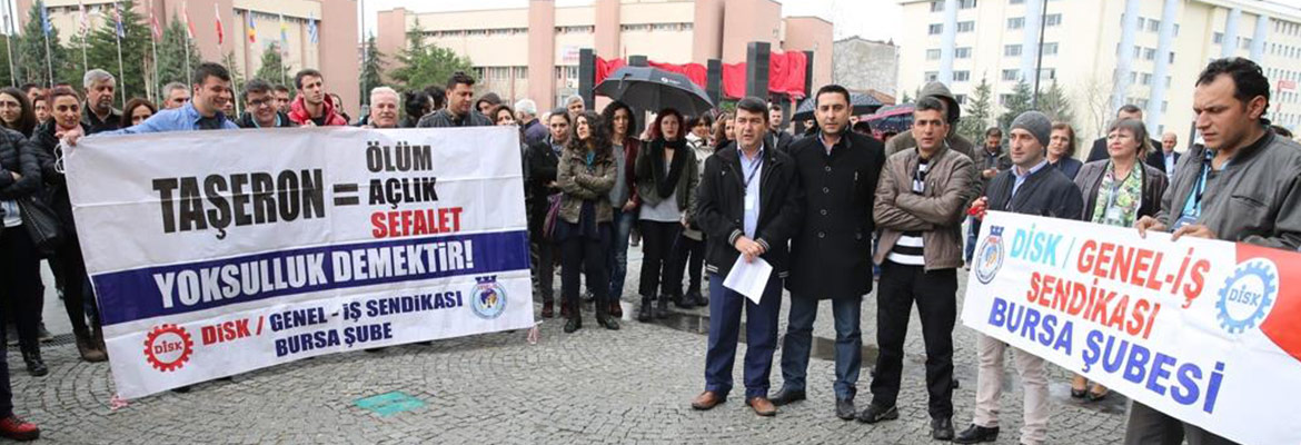 DİSK/Genel-İş Bursa Şubesi, taşeron işçilere verilen kadro sözünün yerine getirilmemesi, kıdem tazminatının fona aktarılmak istenmesi ve ‘Özel İstihdam Büroları’nın getireceği tehlikeler hakkında basın açıklaması yaptı. Şube Başkanı Selahattin Atak, ‘Bu tasarı ile insanlık onuruna yakışmayan köle simsarlığı yasal hale getirilmek istenmektedir. Özel istihdam bürolarına geçici iş ilişkisini de kapsayacak biçimde ‘işçi kiralama’ yetkisi verilmesi ve güvencesiz çalışmayı yaygınlaştıracak düzenlemeler TBMM gündeminde yer almaktadır. TBMM’de iktidar partisi tarafından dayatılan ‘Özel İstihdam Büroları’na dair yasa tasarısı, işçi sınıfına köleliği dayatmaktadır. Bu yasa tasarısı bir avuç işçi simsarının ve onlardan işçi kiralayacak bir avuç sermayedarın talebidir’ şeklinde konuştu.