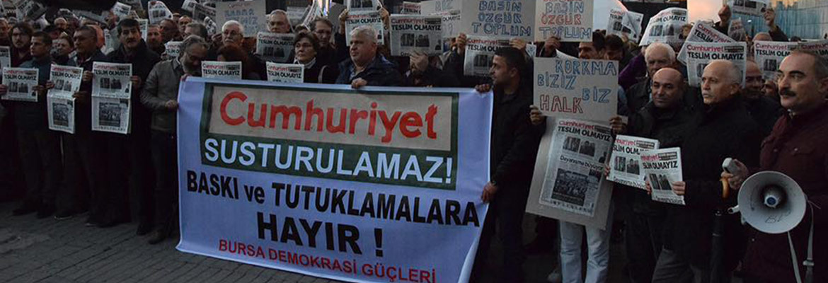 Bursa Demokrasi güçleri olarak, Cumhuriyet Susturulamaz, Baskı ve Tutuklamalara Hayır diyor, Cumhuriyet gazetesi başta olmak üzere basın yayın kuruluşlarına yönelik tüm anti-demokratik baskı ve uygulamaları şiddetle kınıyoruz.